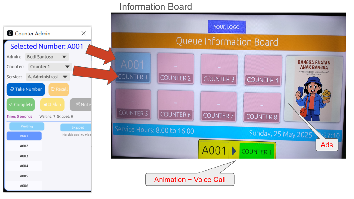 - Digital Information Board: Displays queue data with animations and audio alerts.